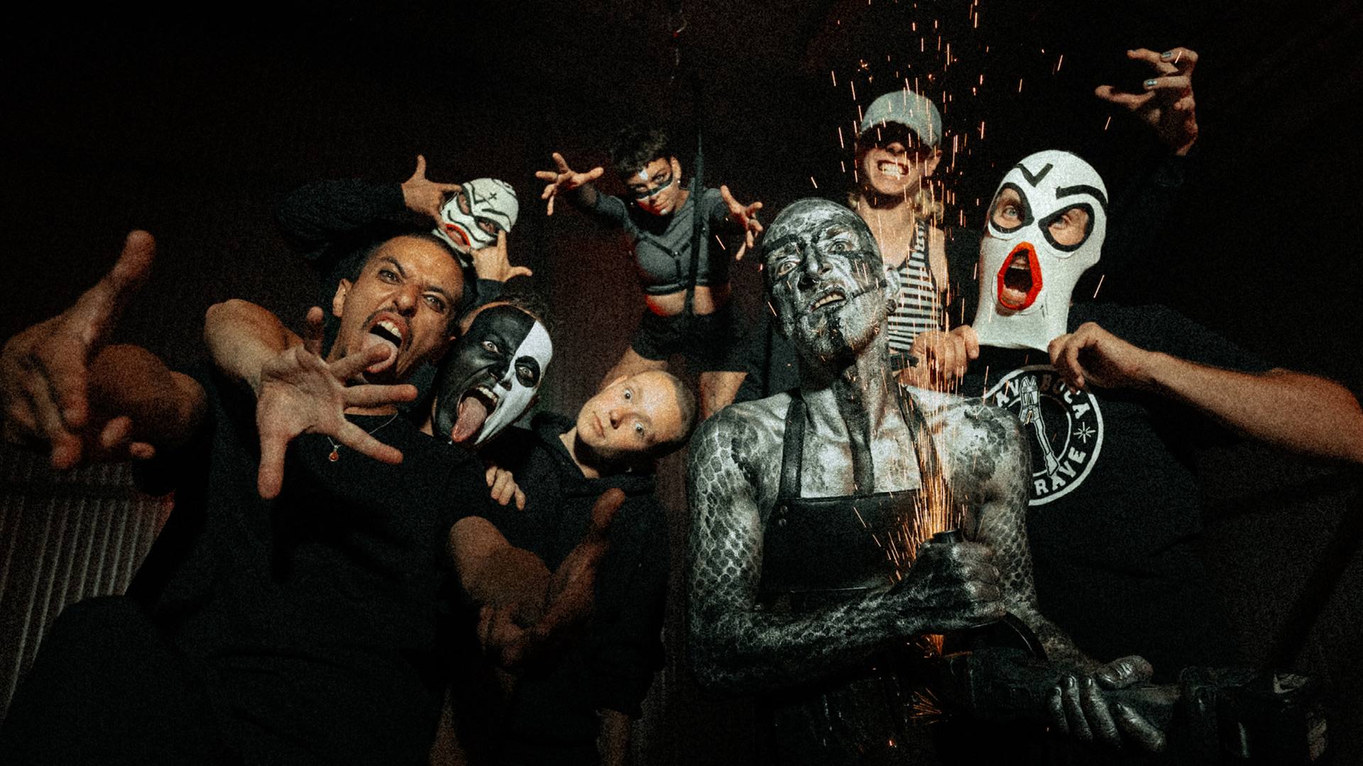 Un rituel punk prenant vie sous les mots de rappeurs masqués et d’un trio guitare-batterie-mandoline, éclairé de performances pyrotechniques et d’acrobaties d’une voltigeuse aérienne. Un live inclusif en forme de transe collective où les spectateurs deviennent acteurs.